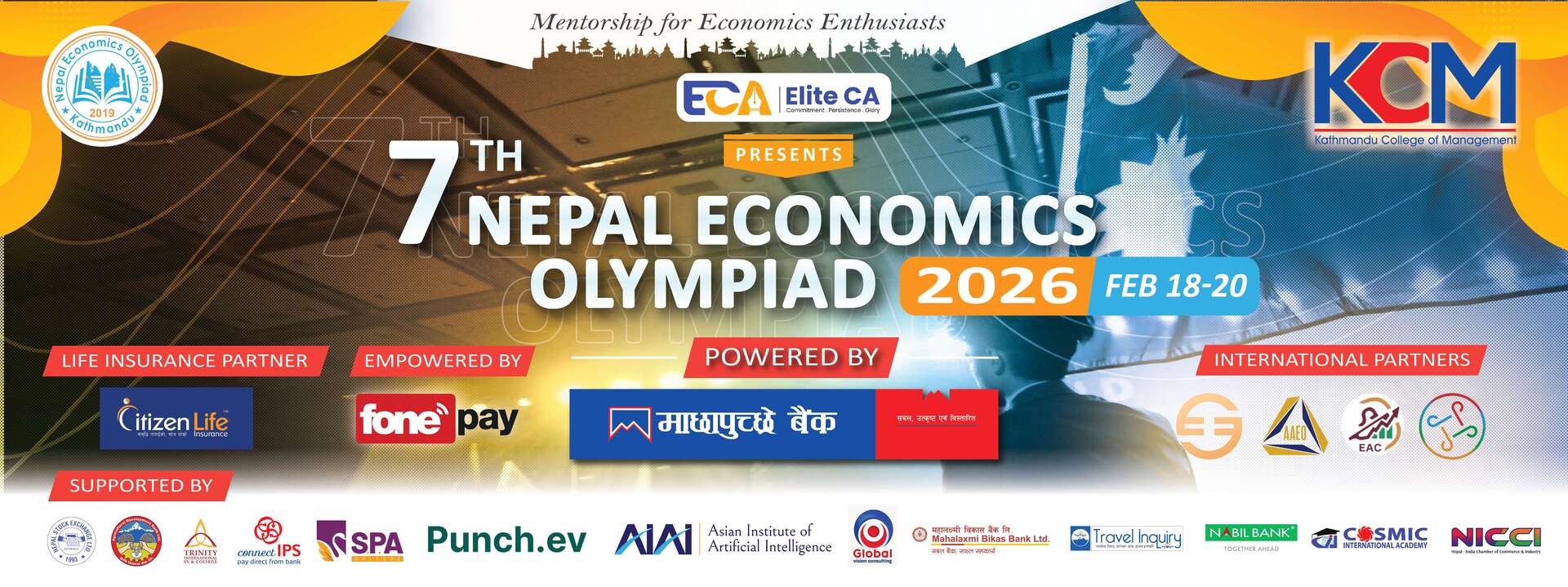 The official logo of NEO 2026 – 7th Nepal Economics Olympiad reflects ambition, excellence, and forward momentum. The bold, upward-moving “7” symbolizes growth and Nepal’s rising presence in economics education, while the vibrant orange accent represents energy and innovation. Together with the strong typography and event dates, the logo captures the spirit of academic rigor, youth empowerment, and national pride that defines NEO 2026.